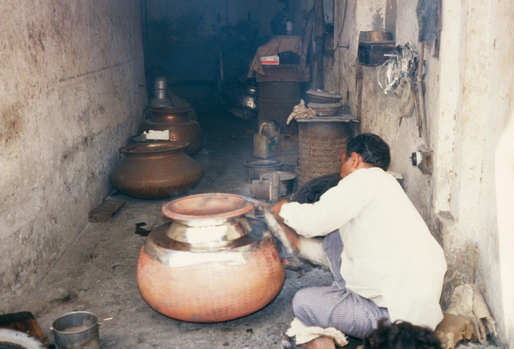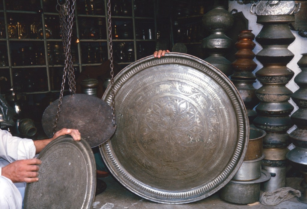 We couldn’t find anyone to tell us where the copper bazaar was as no one spoke English but we knew we must be getting near as the shops/stalls began to stock pots and pans and, sure enough, on the corner there was one which had towers of large brass copper containers, one standing on the other to make a pillar of pots And we saw down a covered bazaar other similar pots, together with all kinds of other utensils. We had arrived!