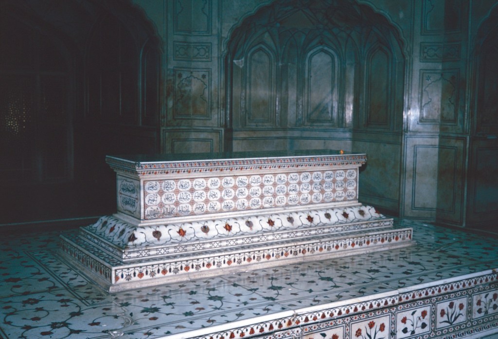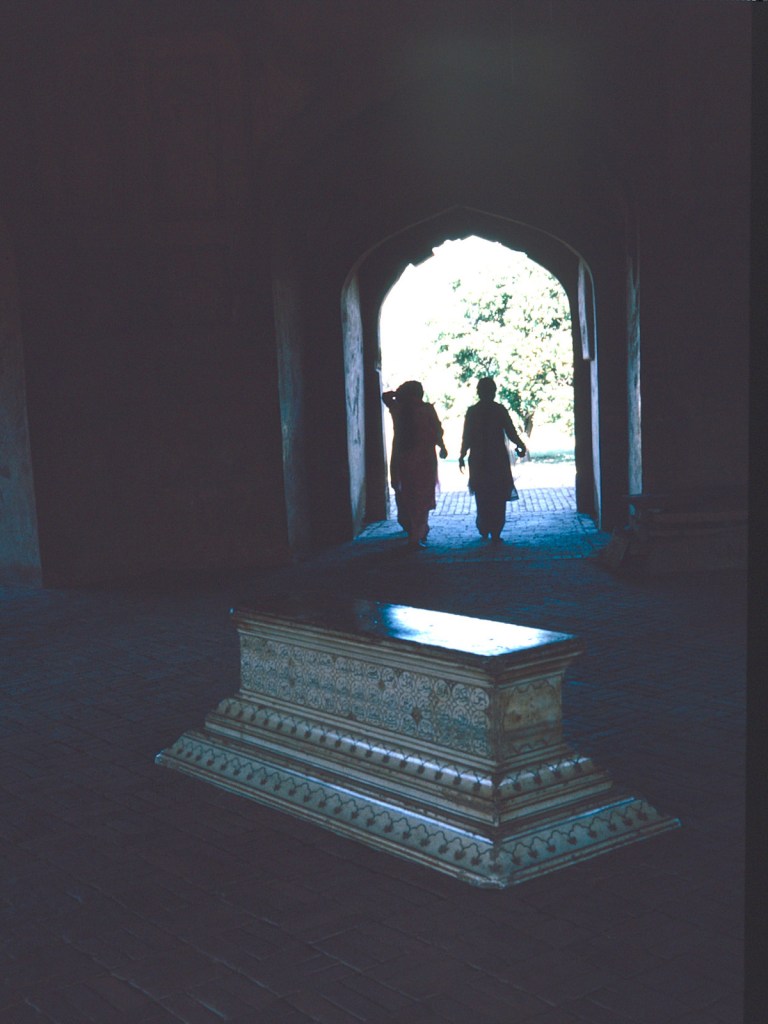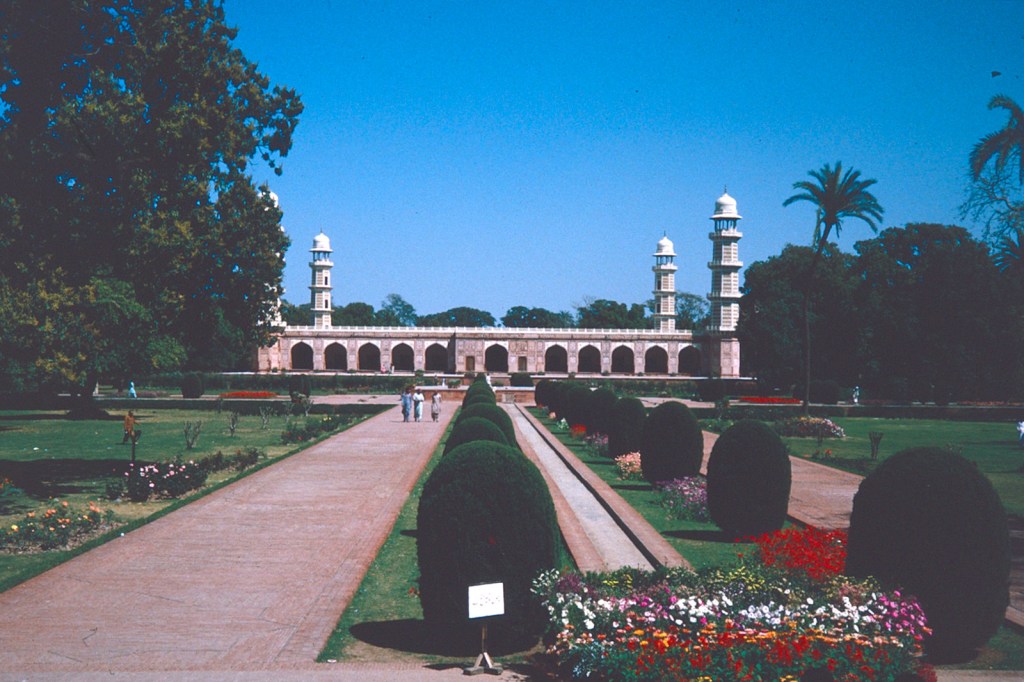 The walled area around the tomb was divided into two large courts with lawns and gardens beautifully kept, lovely flowers and tall trees. We traversed the grass towards a gateway with surrounding buildings which you pass through, up steps and then down again into the court where Jehangir’s tomb lay. This side of the complex was even more beautifully kept.