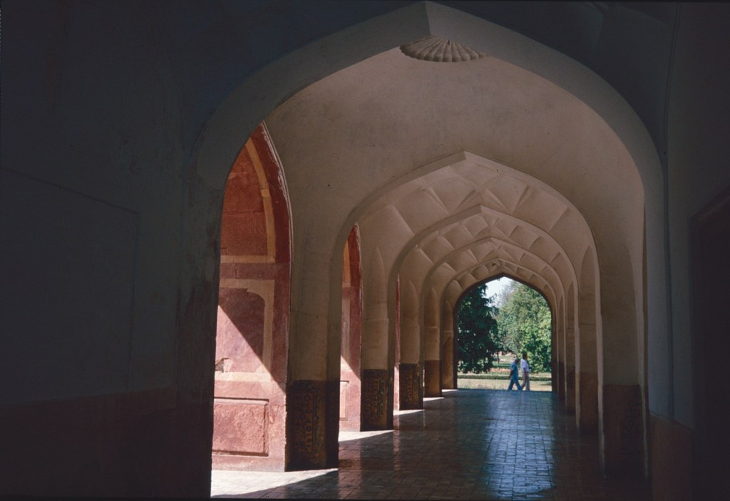 As we approached the tomb irrigation water was being released onto the grass under high trees and children women were paddling and dancing about it. We stopped at a central marble fountain halfway down the path to the tomb raised on a square plinth. It had clean water in it. We surveyed the tomb enclosure built of pink sandstone with at each corner of fine high minarets, Mogul-domed, the pillars facing in a horizontal zigzag stones – most unusual.