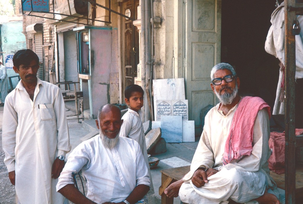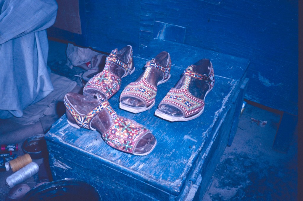The shalwar khamiz, baggy, very baggy, trousers with a matching loose shirt flopping down to knee length or below is invariably from worn by men, in white or some sober colour and over everyone’s shoulder a shawl is draped. Perhaps this is for the cool season. A great variety of footwear is worn; some men wear traditional slippers, embroidered with gold, silver or coloured threads with high pointed-back curly toes, whilst others preferred chappals which could also be embroidered. It is strange to see highish heels albeit blocky and sturdy on some shoes, and you can even see men wearing ladies sandal types. Beards and moustaches are de rigeuer.