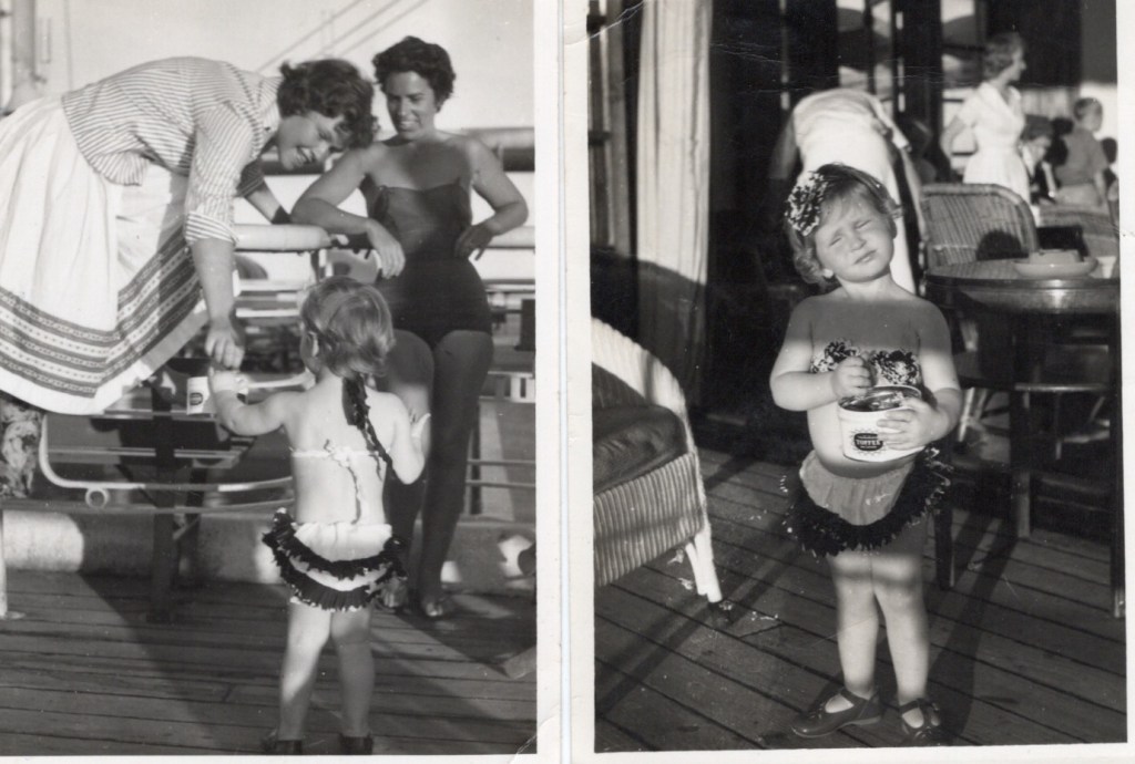 By this time my parents were living in Dar es Salaam and my father had a job in the Ministry of Foreign Affairs. They travelled back to Dar after home leave in England on the Durban Castle, stopping at Malta and Aden, where they bought a gramophone and entered the fancy dress competition, ‘Tom and I in ghastly masks, as an ayah and baby (the pram has never been the same since) and Vicky as a very cute little pin-up girl in black and white and frilled panties and bra (see below). She was killingly funny when she ran on to be judged – everyone clapped so she stood in the middle of the room and clapped delightedly herself.’