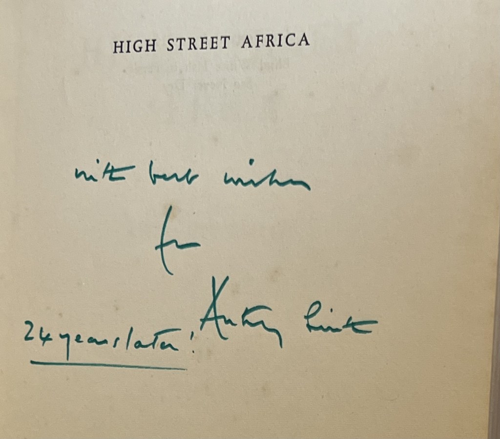 They had another literary success with an encounter with Anthony Smith who recorded it in his travel memoir, ‘Yes it is us in High Street Africa – in fact if you have kept my letters you would be able to look back and find the incident in the funny old hotel described …I simply daren’t spread it about here that it is us as I couldn’t face people’s reactions especially as what I am supposed to have said is absolutely fabricated’.
