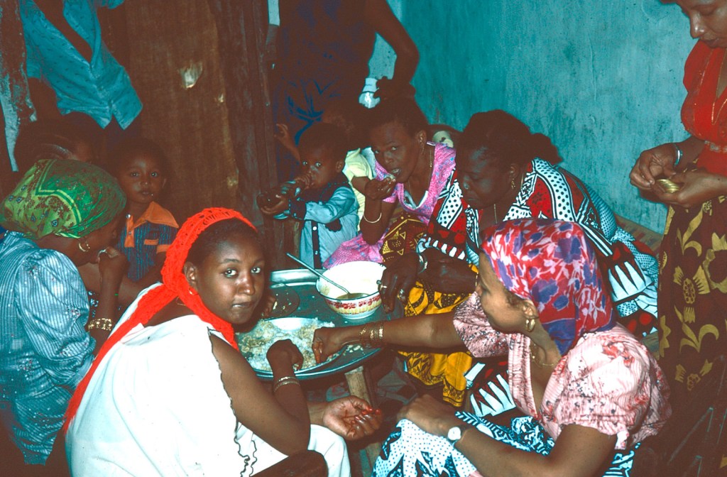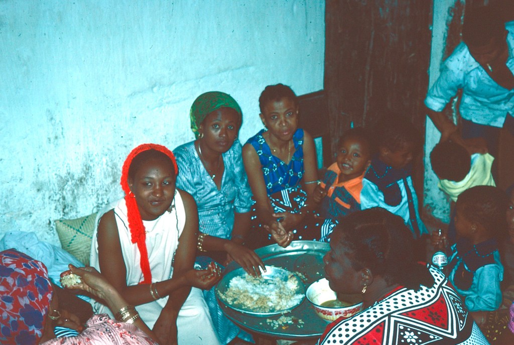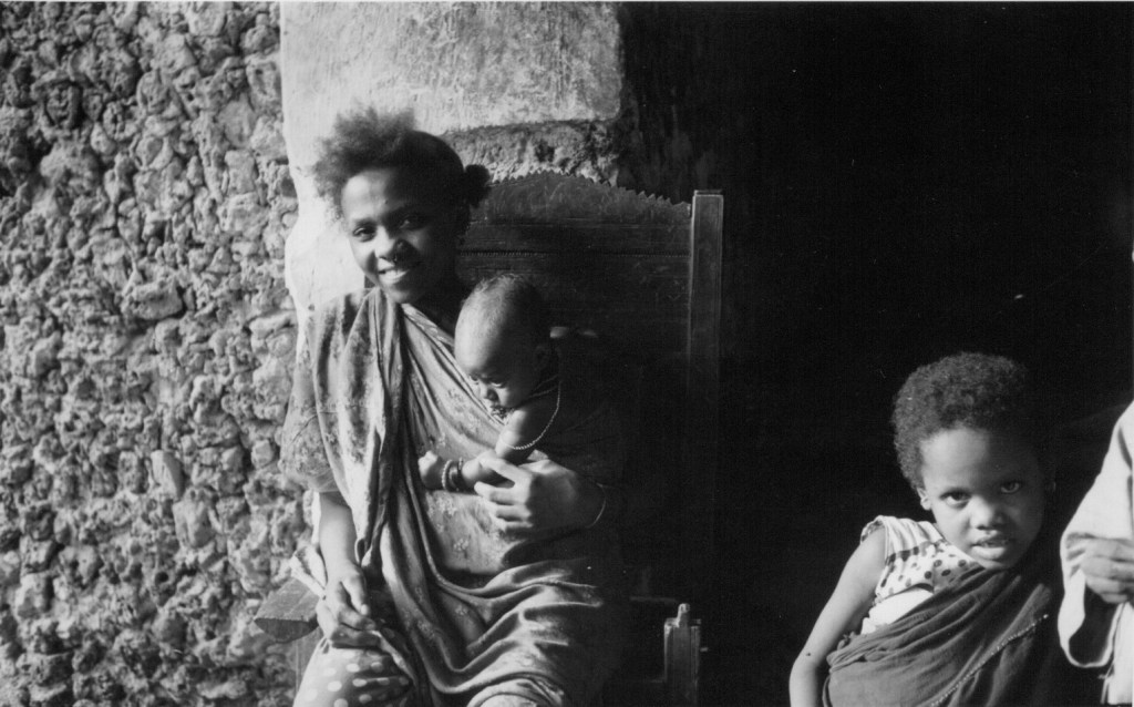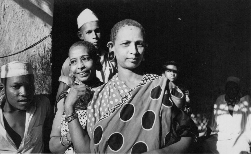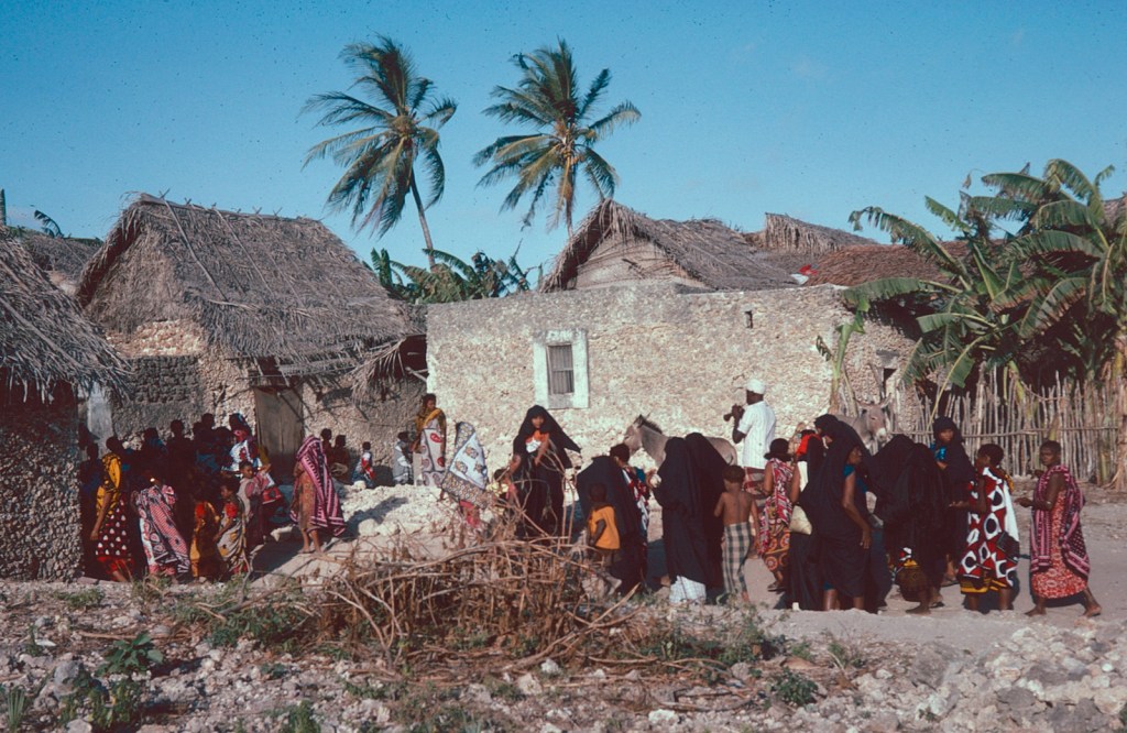 Now it was the turn of the women to visit the house and this they did crowding into the courtyard and chanting in unison. After a while they moved over to the house next door, where we had tea and the kashafa [?] and for a short while pairs of young women bound khangas round their bottoms and wriggled them in time with the music, shuffling from foot to foot. But it didn’t last long and soon the women broke up, clusters of them chatting together whilst others drifted off home, children dangling on their hands or smaller ones carried in arms.