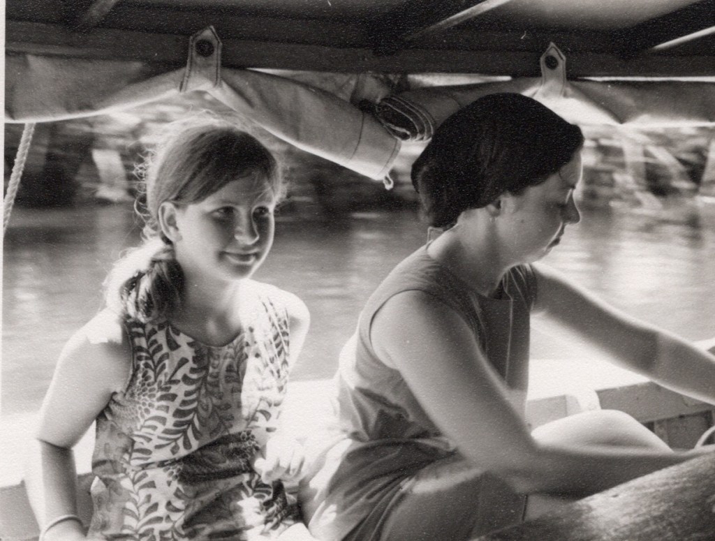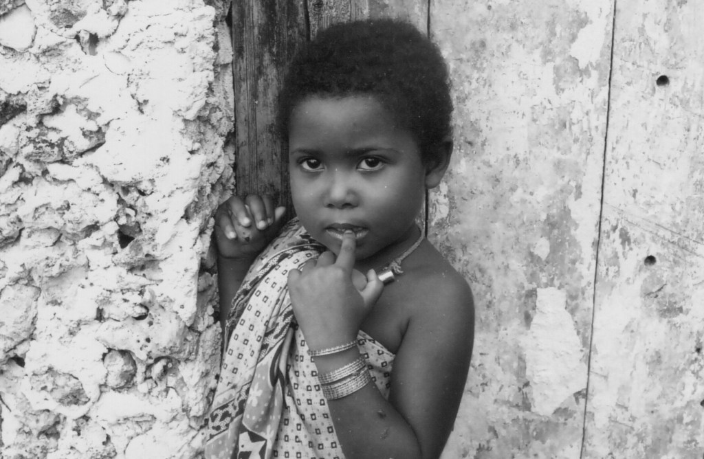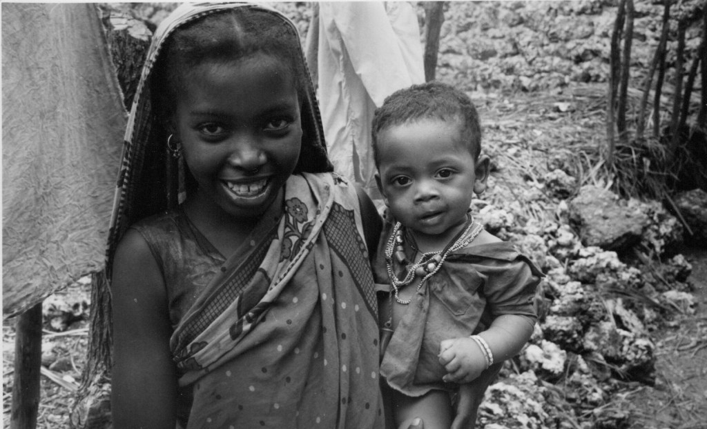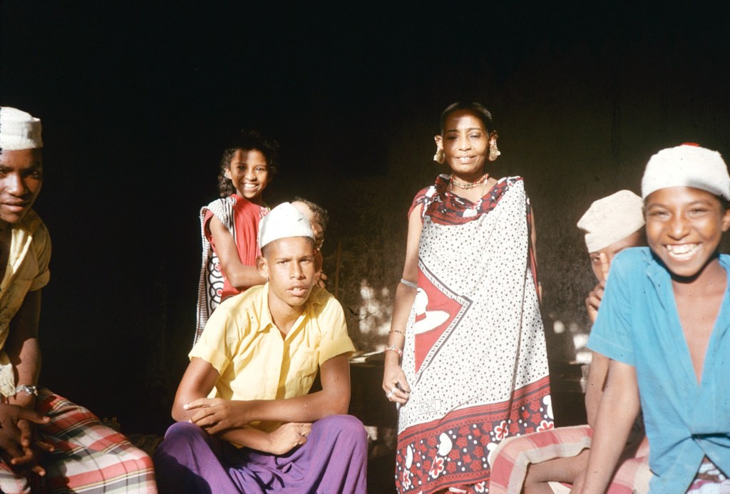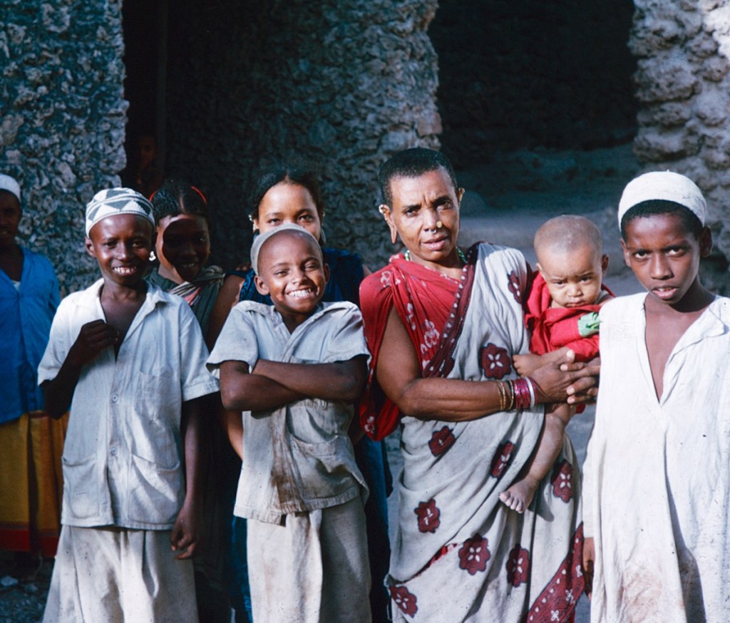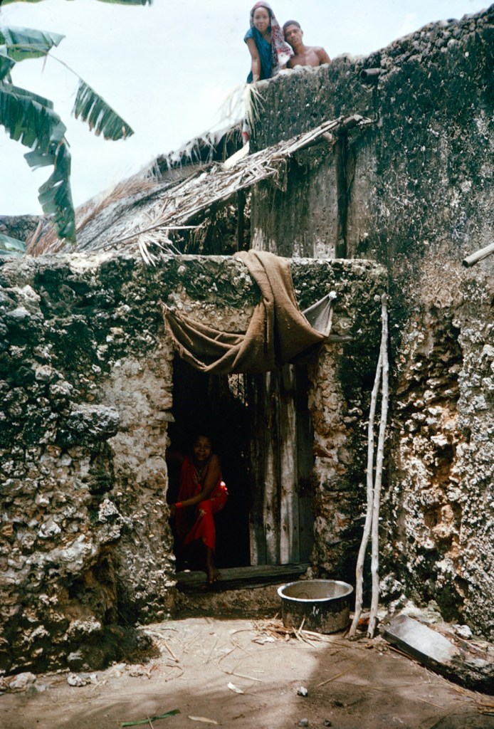 I fist visited Pate with Mum in 1968/9. We stayed overnight in one of the ancient houses and it was pretty horrible. Very hot – especially the walk from Mtangawanda to Pate town – and swarms of mosquitoes. No beds to sleep on, just mats on the roof. Obviously no electricity or running water, and the long-drop loos were pretty filthy. It took me a long time to get over it! Here a photo of me on the boat with a friend of Mum’s.