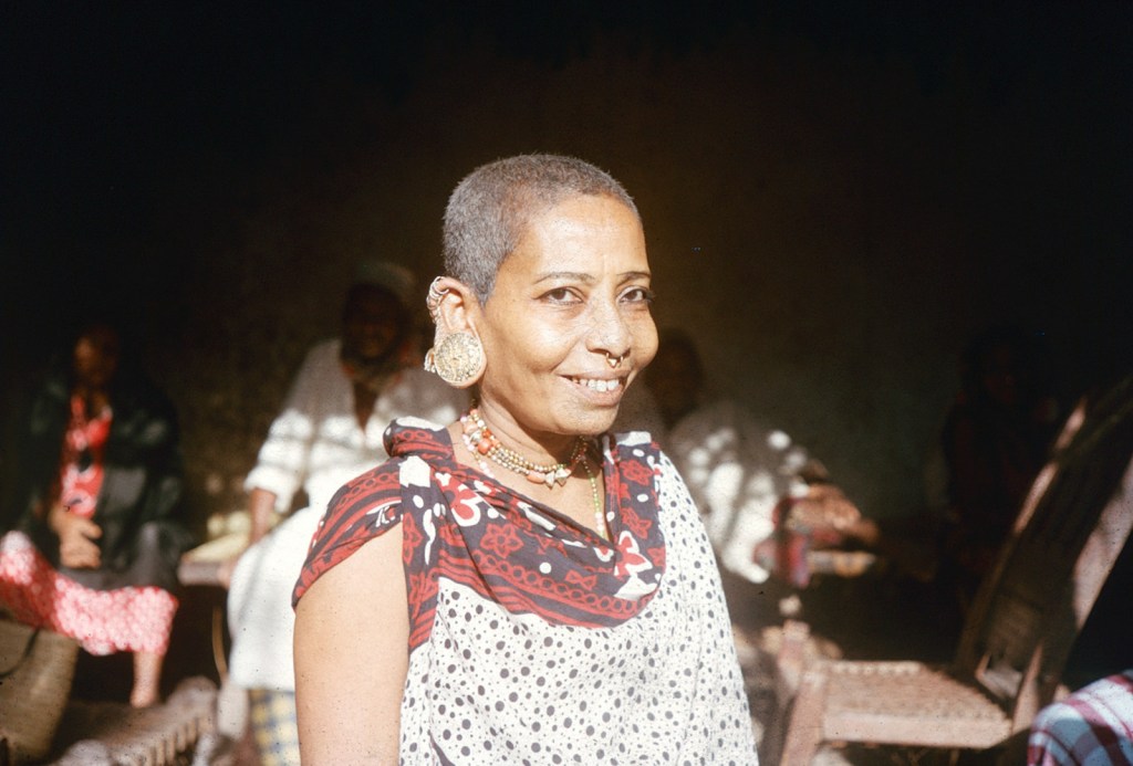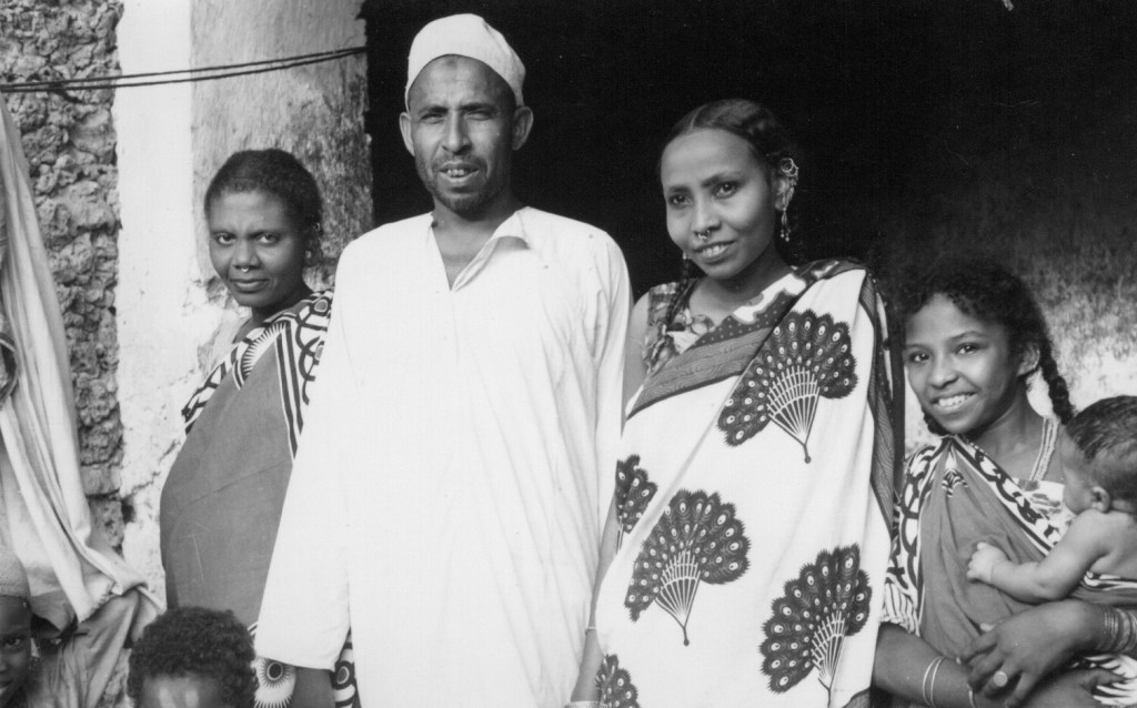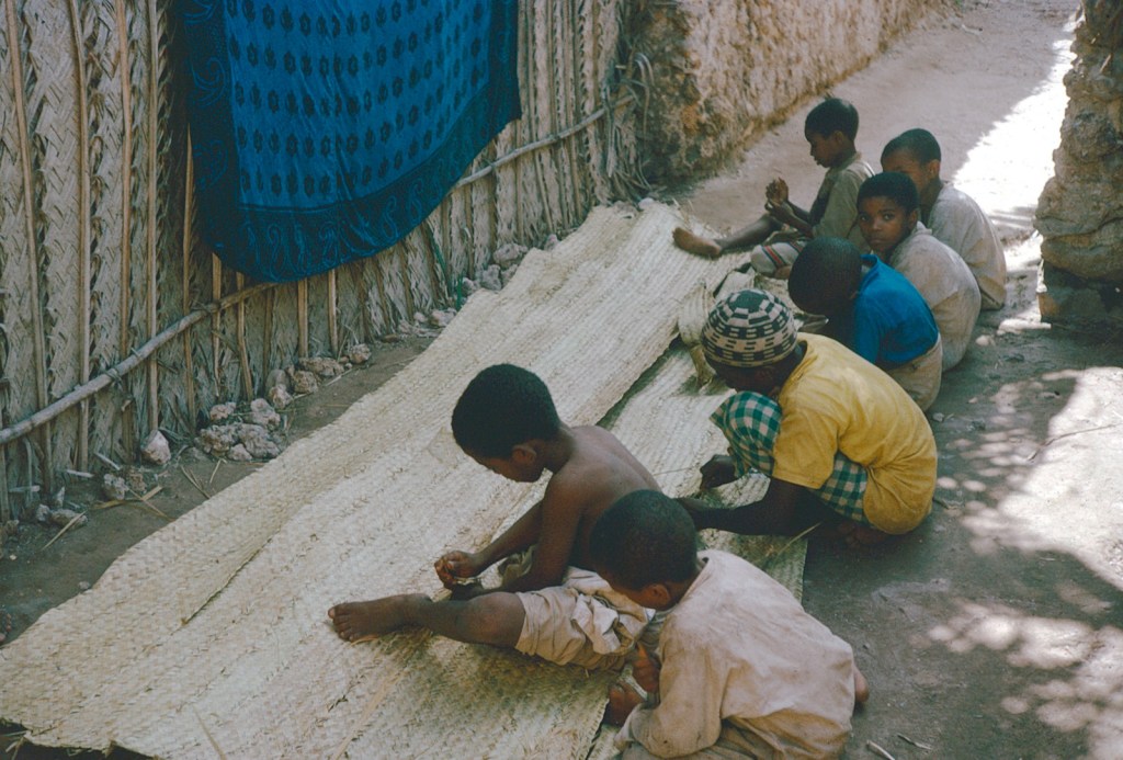 I found that I had been moved out of Esta‘s house to a neighbours where Nana and the rest of the Faza lot were getting dressed. Yet another a lot of glamorous dresses had been fished out of their luggage, even huge Khadija was robed in a voluminous brightly flower dress with khangas. Nana was in a basically brown creation with a gathered top and overskirts of a pretty tawny flowered nylon georgette, and was busy making up her face and eyes. She is clearly the success of the family, emancipated and smart and she knows it – bidding everyone including me to hold things for her, or put away something else, find whatever she has lost. They had all had yet another bath and were somewhat surprised when I said I didn’t want one. I’d come to the end of my clothes and though I wanted to wash and have and have a cool drink, or even a cup of tea, it all seemed pointless. The children, all boys, were being skinned of the last lot of finery and clad in the next lot – mostly all made of women of woven nylon of a terylene type – no wonder the baby yelled.
