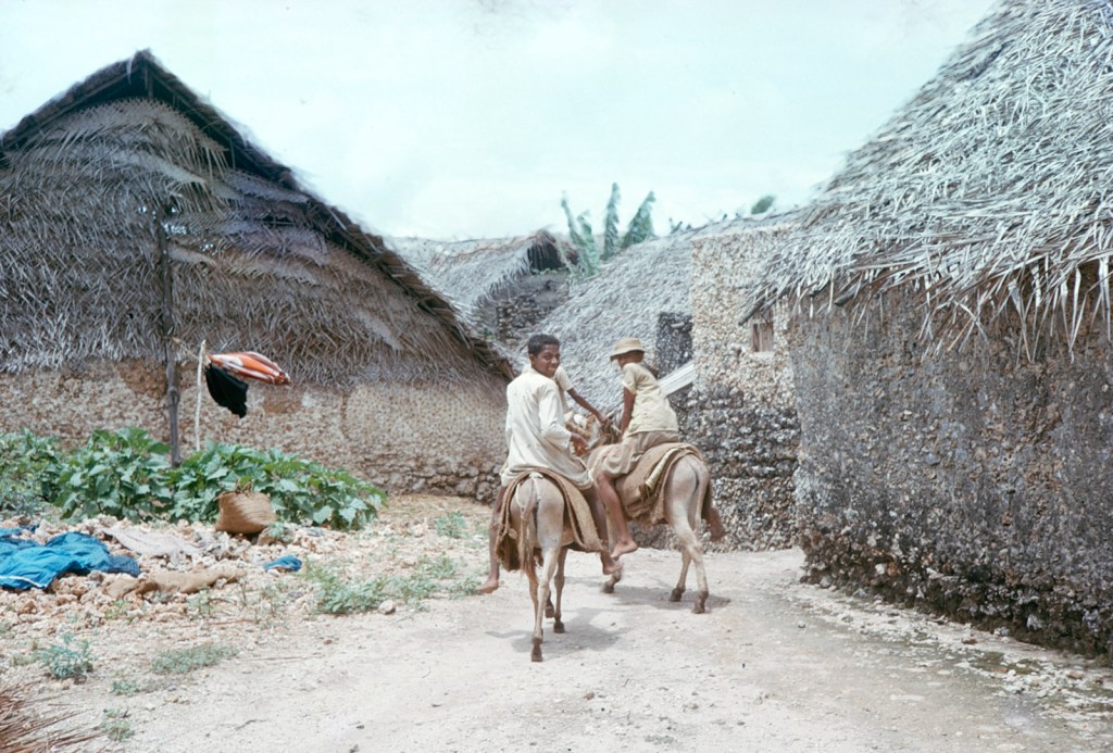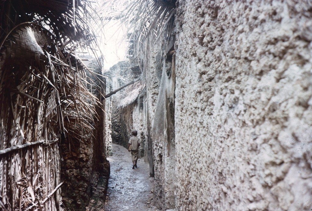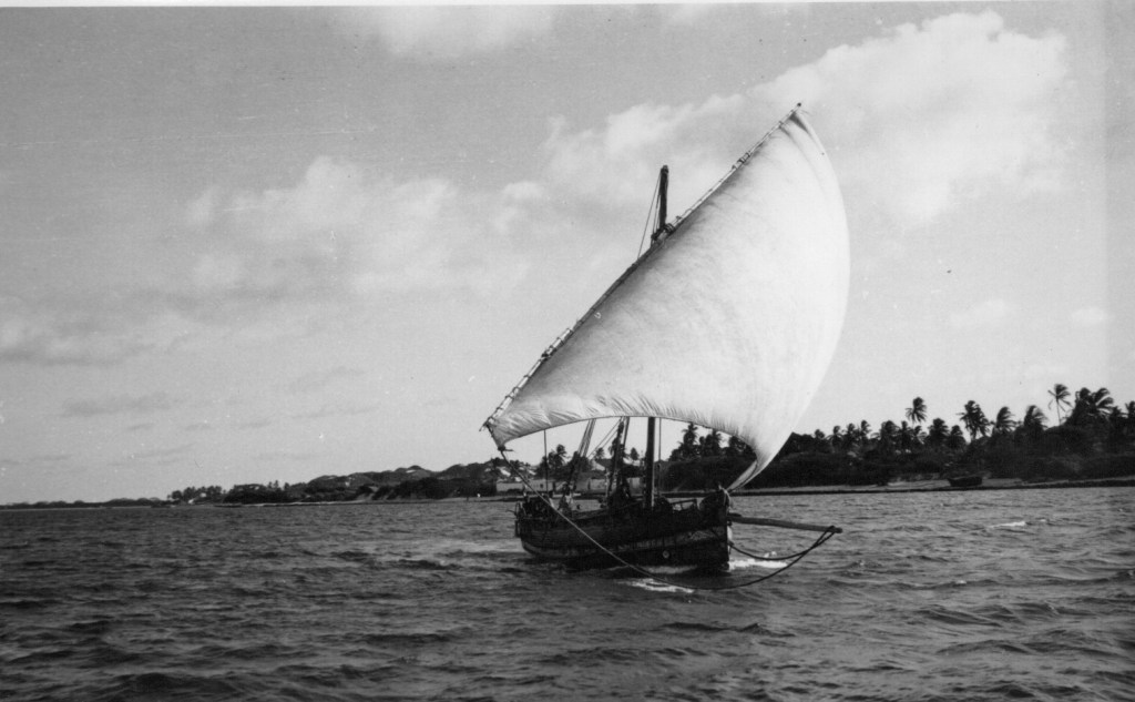 The sand dunes of Lamu appear and then the roofs of the houses, smouldering in the grey midday haze. Sea is a fine grey blue hue and calm, no trace of the wild waves of the open sea. My poor chicken has had a horrid journey, wedged between the luggage for safety: once or twice it had a flutter for freedom. The boat boy – can’t be more than nine or 10 – is a treasure, thin and lithe, he applies himself with energy to whatever task whether baling out the bilges, collecting the fares ( it is 7/- from Mtangawanda) or attending to boat and passengers needs. A gang of unattractive youth sit on the for’ard cover, refusing to move to lighten the load when we were in the rough patch.