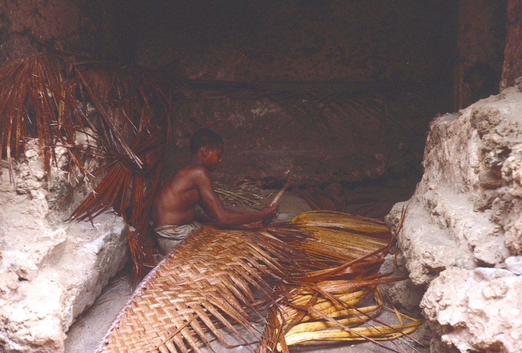 She was sitting plaiting a section of a mat in her dark somewhat primitive and grubby house. All chairs and beds lined the walls. The younger relative was grating a coconut whilst another dashed out to buy me a Pepsi, the money having to be undone from knot in Tabir’s khanga. She is over 90 and doing very well, she says she’s poor but nonetheless insisted to rush out and buy me two mangoes and another relative brewed up hot, sweet milkless tea which was very welcome. After consuming half of each I gave over the rest of those standing around. Saidi had some of each drinking his tea from the saucer as is customary.