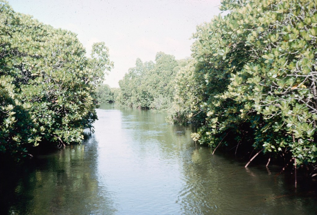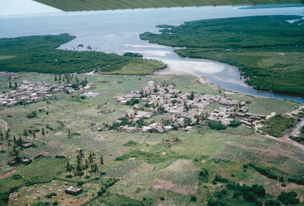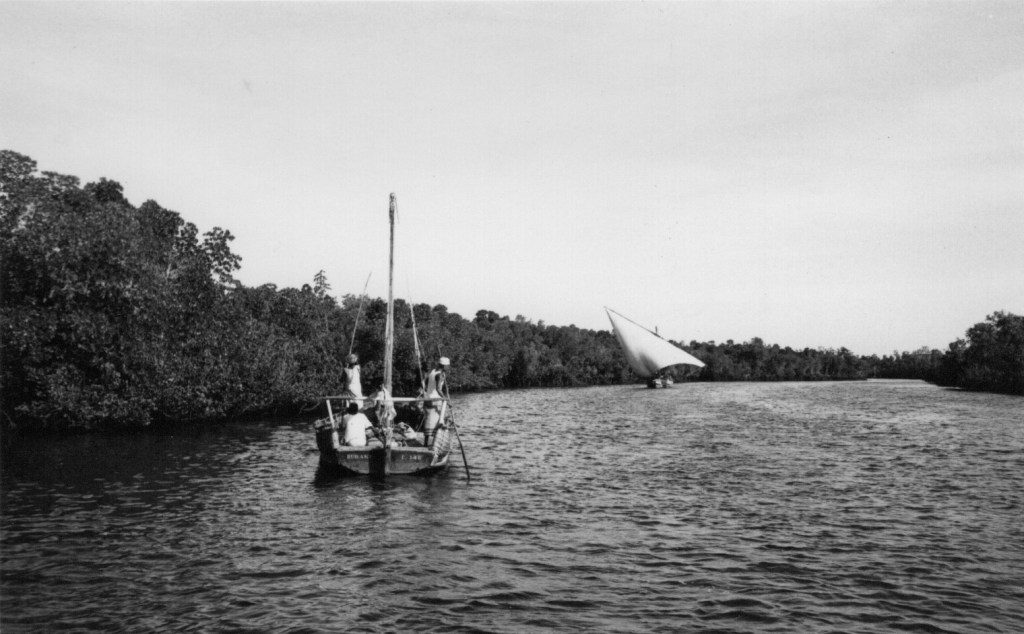 At last the Mkanda was reached – fetching out a khanga from my kikapu, I was able to wrap it around me take off my sudden shirt underneath it and everyone taking a good look at the operation but it was achieved with great decorum, though I fear I am so wet that I still leave a round damp patch where I sit. There’s still enough water in the channel to pass without sticking, we let down a passenger at a small landing place between the mangroves, he paddling off with a bushel of bananas on his head, and soon the open water is reached.