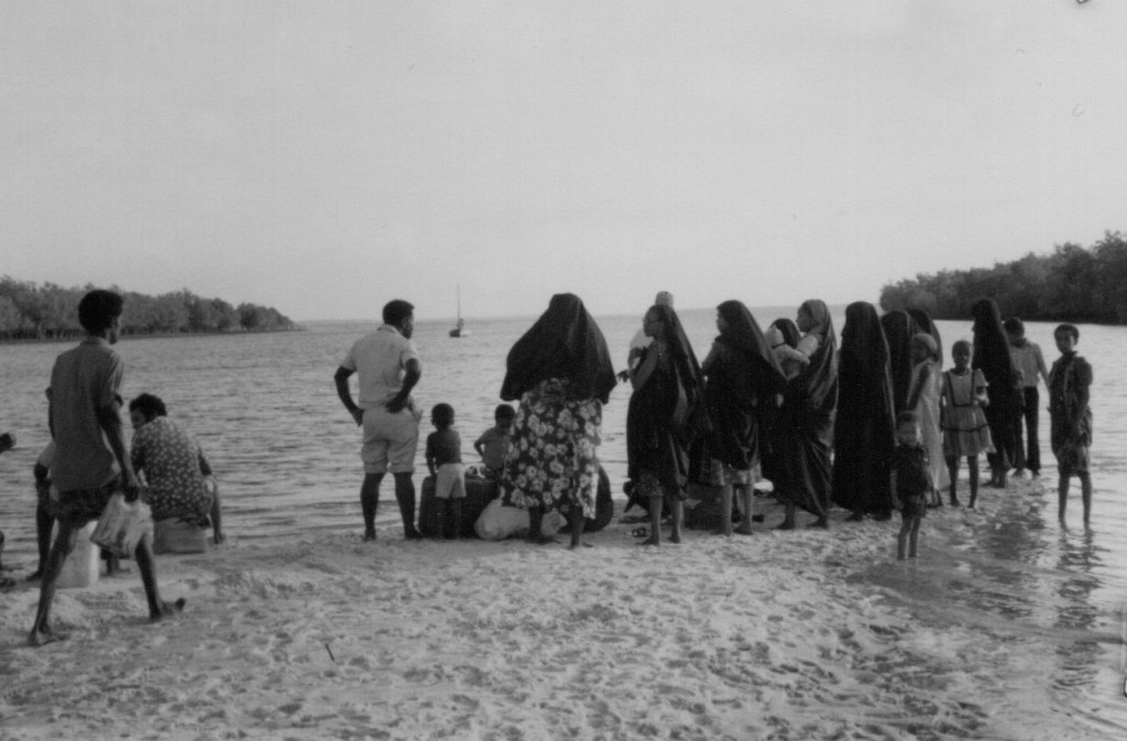 No boat came and a small crowd sat forlornly under a thorn-bush, wondering what to do. A plump Pate man in trousers and bush jacket, embroidered cap and a beard suggested we might hire a dhow between us. He went off to enquire. It was clear he hadn’t succeeded in his bargaining for he hung about on the jetty and when asked. on sauntering back, said 300 shillings was the price and that’s too much. I agreed. He said well he will wait till the next day and what did it matter about food? I didn’t agree with him as, though not hungry right now, was very thirsty and, with only two mangoes from Mwana Tabir, didn’t think it would be much help as they’d have to be shared. We waited on Mtangawanda, place of black sand, really describes it. I wondered what minerals it contained?
