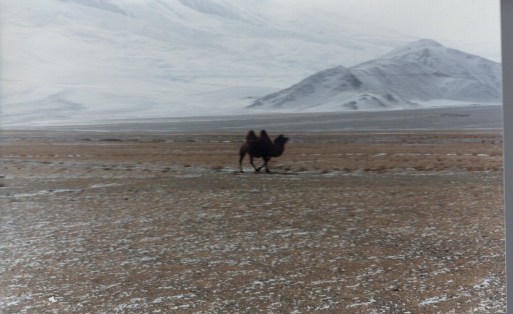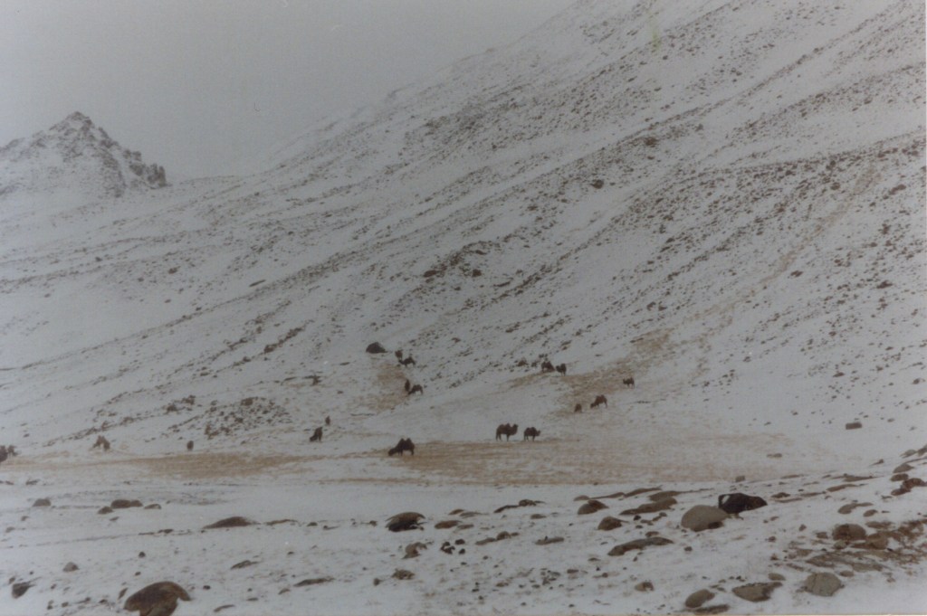 The following day was sunny and they drove along ‘through a rocky valley with little habitation or cultivation, snow-capped mountains, magnificent in the sun, on all horizons. Occasional groups of yak dotted the road and as we reached the snow line on a wide elevated plain, where the road snaked down in twists and turns towards a broad valley, we saw our first dromedary [Bactrian] camels of the day… I think the scenery today has been the most spectacular because it is so wild. We passed through a few settlements or villages every now and then; we had to drive very carefully because of landslips of stone and mud on the road. Luckily nothing came down on us.’