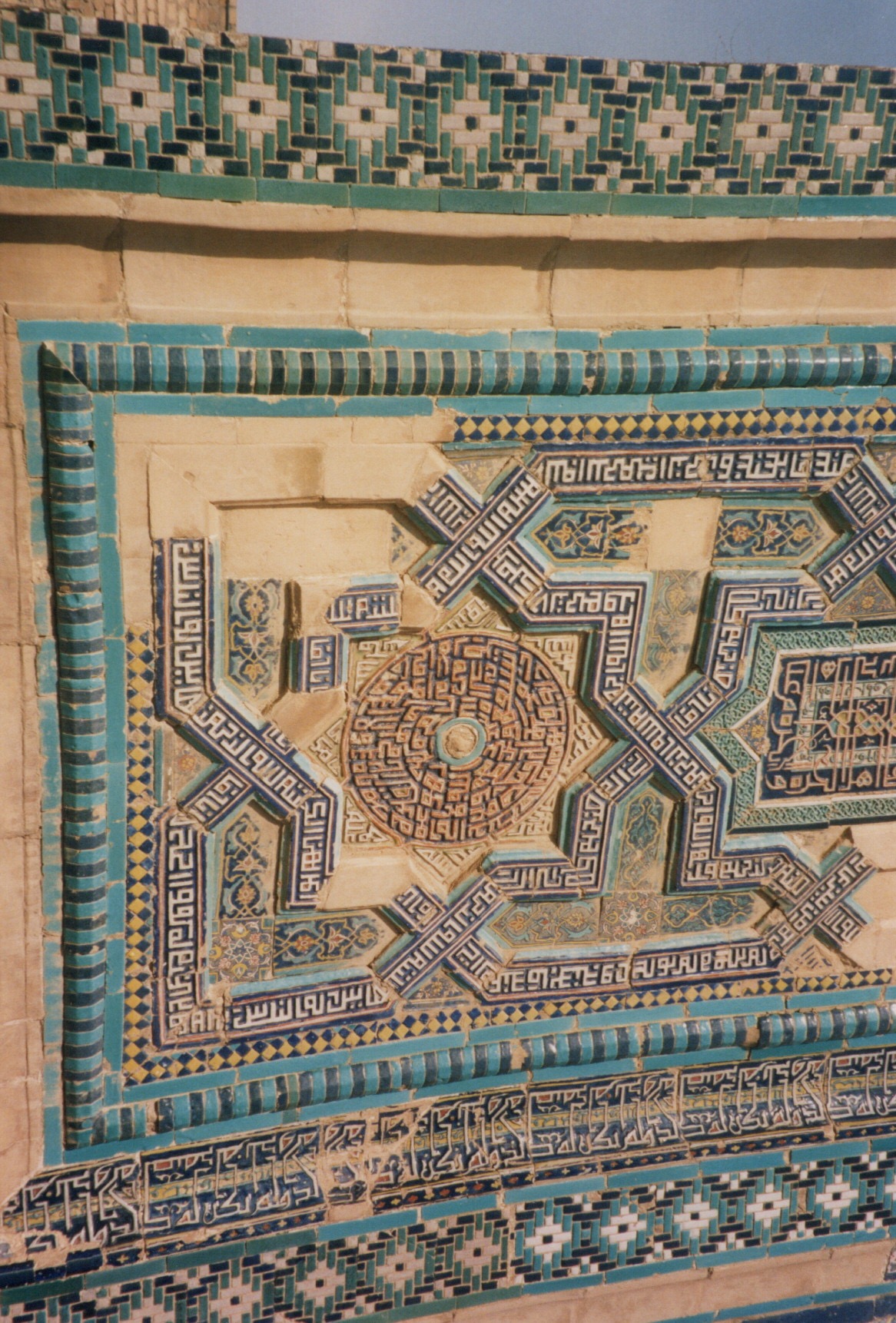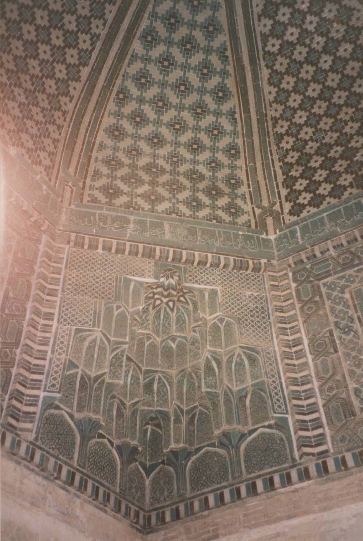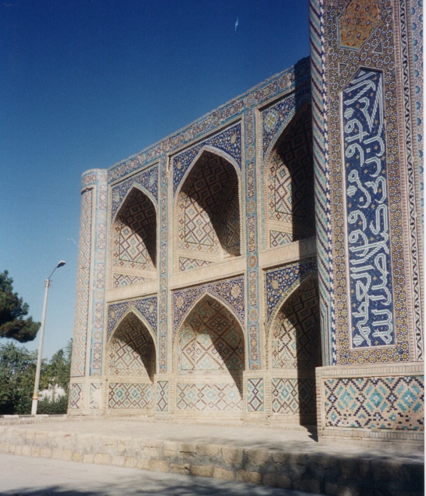 In Bukhara, they stayed at the Taj hotel, but there was no hot water much to her disappointment. They did the usual rounds of the tourist sites and again some shopping. She bought me a ‘fairly large faded red embroidery’ which I still have. Her main observation about Bukhara was ‘the tile work in central Asia is much more geometric than in Iran – to my mind Iran scores for richness of colour and flowing floral designs though if my memory is correct the minarets are tallerix central Asia as here in Bukhara.’ Below the tiles on the left are from Samarkand while the tiles on the right are from Isfahan.