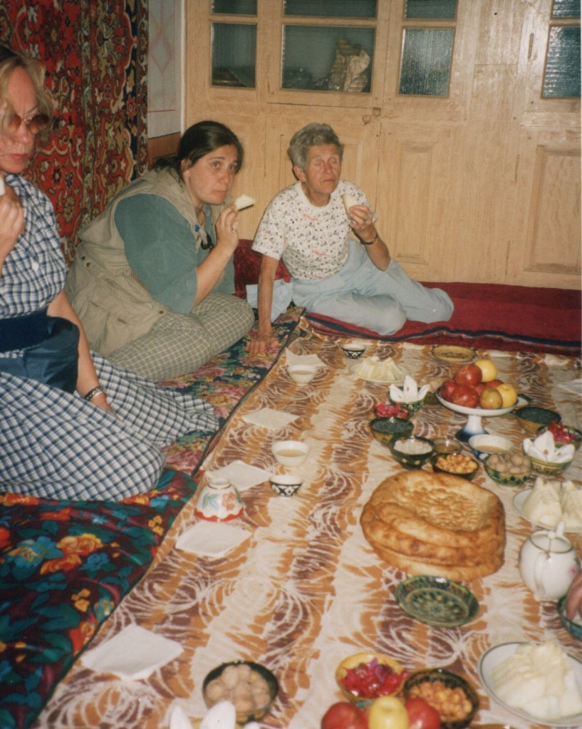 Eventually they reached Narya in Kyrgyzstan where they met their Russian guides and had a splendid spread for dinner washed down by copious amounts of vodka and tea, ‘all spread out on a long table covered with a bright oil cloth. Toasts and speeches and general bonhomie after dinner, Sergei got out his guitar and sang softly, sad Russian songs, sometimes joined by Margarita; the host also played and sang. More and more vodka. We all joined in the songs and went to bed when the vodka was finished at about 1030.’