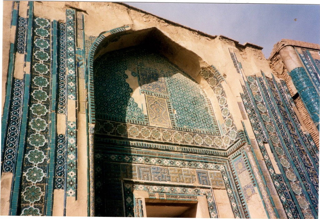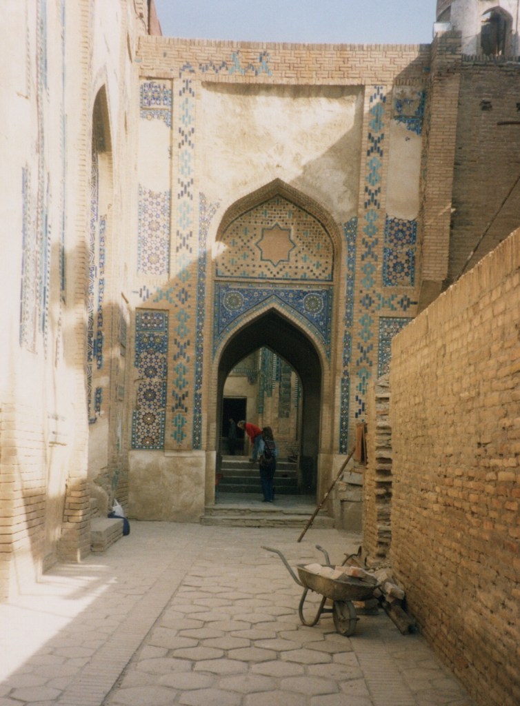 She was disappointed, as she was to be in Samarkand, that many of the places were undergoing repairs, ‘and scaffolding embraced many minarets and iwans of a mosque and often we were unable to go in at all’. She was also disappointed with the bazaars: ‘remembering the magical bazaars at Isfahan and Shiraz and even Tehran. Although it was some 20 years ago, they cannot hold a candle to them. You didn’t see for instance the workers in copper and brass brass banging away in deafening harmony – most shops seem to be selling not making; on occasion you came across a scissor-making workshop or potters’ yards, where the artisans proudly showed you recommendations and certificates awarded them by UNESCO or some other well-known body.’