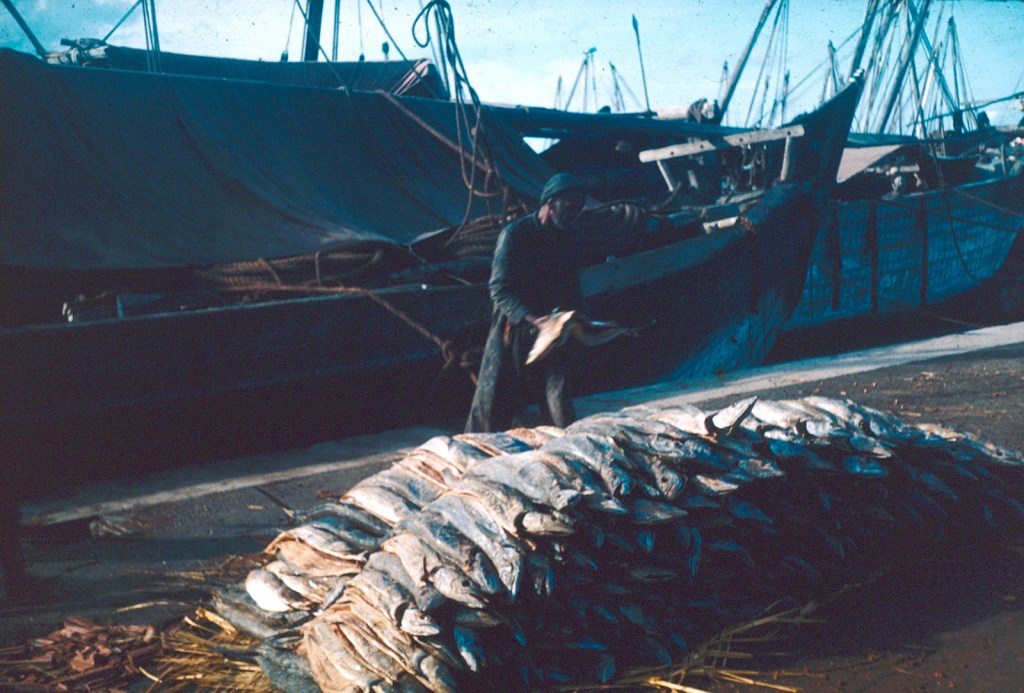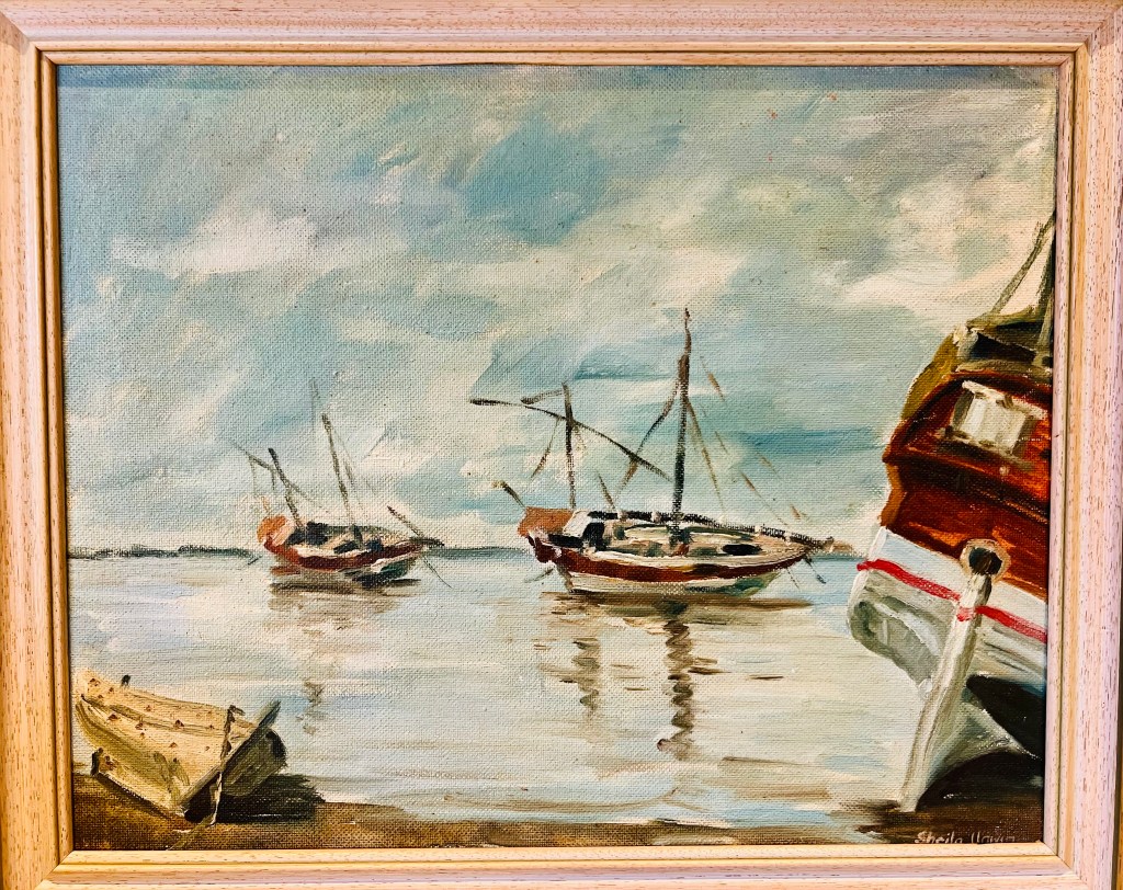 ‘We witnessed what seemed to us a most antiquated ceremony, of the Sultan’s son receiving eminent people on the occasion of Idd – all the colonial people in full fig.’ It was also the first time she met Mohammed Matar, her chest dealer, ‘quite blind although young’. She made her first major purchases from him in 1963 and reckoned she made £100 profit. On that visit she painted a picture of dhows which I still have on my wall.